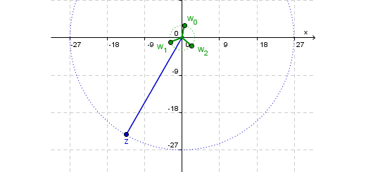 Dado o número complexo $w = 27\operatorname{cis} \frac{\pi }{3}$, determine as raízes da equação ${z^3} + w = 0$, representando as imagens no plano de Argand.