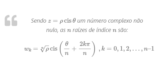 << Enunciado… Ler maisSendo $z = \rho \operatorname{cis} \theta $ um número complexo não nulo, as $n$ raízes de índice $n$ são: $${w_k} = \sqrt[n]{\rho }\operatorname{cis} \left( {\frac{\theta }{n} + \frac{{2k\pi }}{n}} \right)\,\,,k = 0,1,2,…,n – 1$$