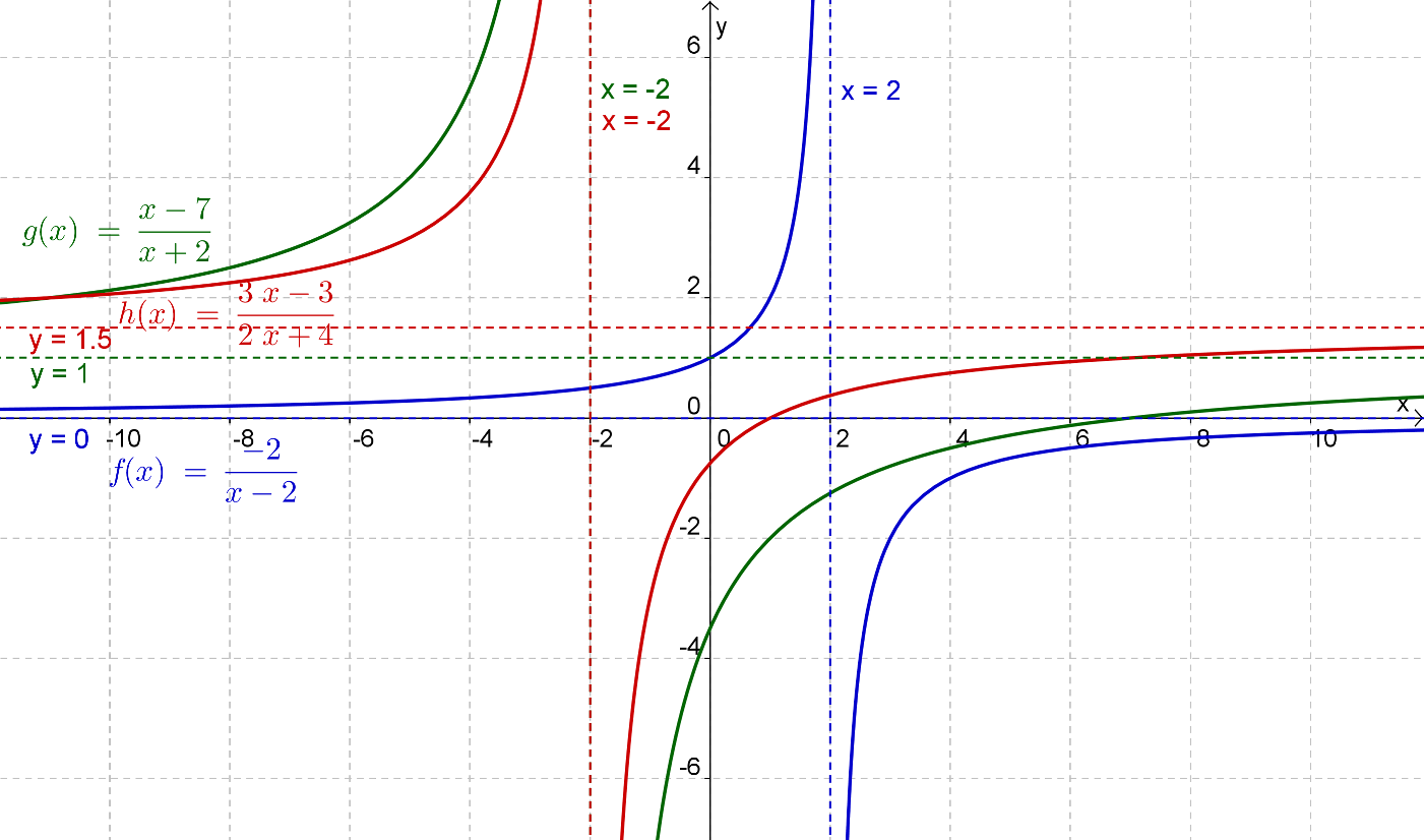 {f\left( x \right) = \frac{{ – 2}}{{x – 2}}}&{}&{g\left( x \right) = \frac{{x – 7}}{{x + 2}}}&{}&{h\left( x \right) = \frac{{3x – 3}}{{2x + 4}}}