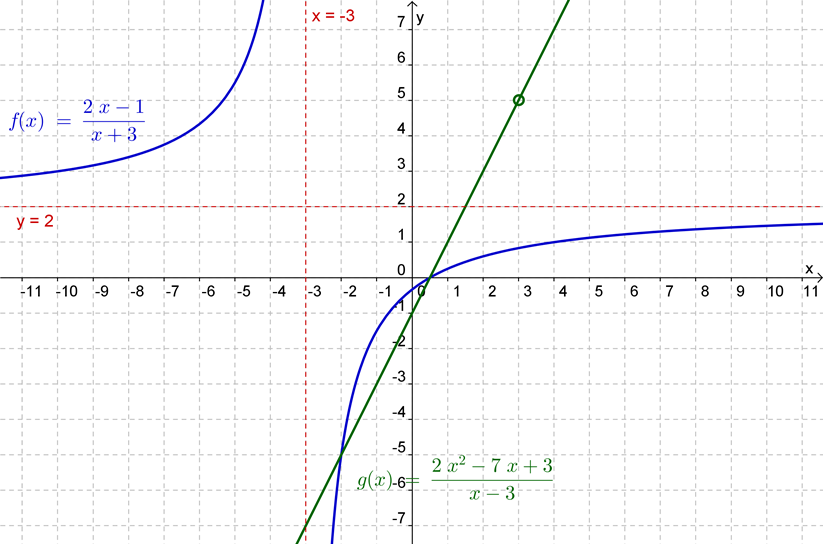 {f\left( x \right) = \frac{{2x – 1}}{{x + 3}}}&{\text{e}}&{g\left( x \right) = \frac{{2{x^2} – 7x + 3}}{{x – 3}}}