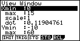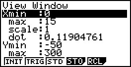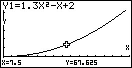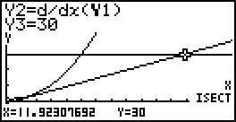 então a bola tem uma velocidade de $30$ cm/s no instante $t = 11,9$ s, aproximadamente.Também se pode obter um valor aproximado desse instante recorrendo à calculadora gráfica: