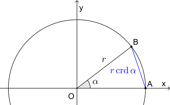 \[\begin{array}{*{20}{l}}{{\mathop{\rm crd}\nolimits} \alpha }& = &{\overline {AB} }\\{}& = &{\sqrt {{{\left( {1 – \cos \alpha } \right)}^2} + {{{\mathop{\rm sen}\nolimits} }^2}\alpha } }\\{}& = &{\sqrt {1 – 2\cos \alpha + {{\cos }^2}\alpha + {{{\mathop{\rm sen}\nolimits} }^2}\alpha } }\\{}& = &{\sqrt {2 – 2\cos \alpha } }\\{}& = &{\sqrt {2 – 2\cos \left( {2 \times \frac{\alpha }{2}} \right)} }\\{}& = &{\sqrt {2 – 2 \times \left( {{{\cos }^2}\left( {\frac{\alpha }{2}} \right) – {{{\mathop{\rm sen}\nolimits} }^2}\left( {\frac{\alpha }{2}} \right)} \right)} }\\{}& = &{\sqrt {2 – 2 \times \left( {1 – {{{\mathop{\rm sen}\nolimits} }^2}\left( {\frac{\alpha }{2}} \right) – {{{\mathop{\rm sen}\nolimits} }^2}\left( {\frac{\alpha }{2}} \right)} \right)} }\\{}& = &{\sqrt {4 \times {{{\mathop{\rm sen}\nolimits} }^2}\left( {\frac{\alpha }{2}} \right)} }\\{}& = &{2 \times {\mathop{\rm sen}\nolimits} \left( {\frac{\alpha }{2}} \right)}\end{array}\]