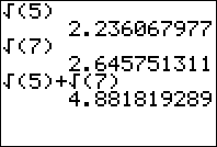 Recorrendo à calculadora, podemos indicar \(4,89\) como um valor aproximado, por excesso, a menos de uma centésima, do número \(\sqrt 5 + \sqrt 7 \).