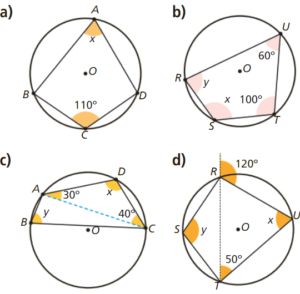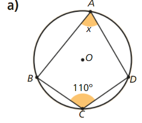 \[x = B\widehat AD = 180^\circ – B\widehat CD = 180^\circ – 110^\circ = 70^\circ \]Alternativa:
