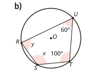 \[y = S\widehat RU = 360^\circ – \left( {R\widehat ST + S\widehat TU + T\widehat UR} \right) = 360^\circ – \left( {120^\circ + 100^\circ + 60^\circ } \right) = 80^\circ \]