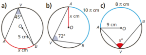 \[\begin{array}{*{20}{l}}{\frac{{\overparen{AB}}}{{360^\circ }} = \frac{{10\pi }}{{{P_\bigcirc }}}}& \Leftrightarrow &{\frac{{{\rm{144}}^\circ }}{{360^\circ }} = \frac{{10\pi }}{{2\pi \times x}}}\\{}& \Leftrightarrow &{x = \frac{{5 \times 360^\circ }}{{144^\circ }}}\\{}& \Leftrightarrow &{x = 12,5}\end{array}\] - Ora,