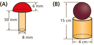 \[\begin{array}{*{20}{l}}{{V_{\left( B \right)}}}& = &{{V_{Cilindro}} + {V_{Esfera}}}\\{}& = &{\pi \times {2^2} \times 11 + \frac{4}{3}\pi \times {2^3}}\\{}& = &{44\pi + \frac{{32\pi }}{3}}\\{}& = &{\frac{{164\pi }}{3}}\\{}& \approx &{171,7}\end{array}\]