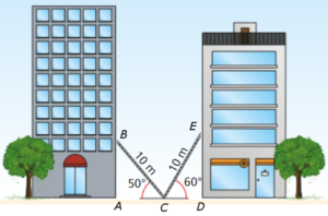 O Rogério encostou uma escada com 10 metros de comprimento a um prédio do lado esquerdo da sua rua, formando com o solo um ângulo de 50 graus.