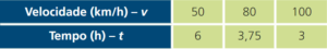 A tabela seguinte estabelece a relação entre a velocidade média e o tempo gasto em cada viagem.