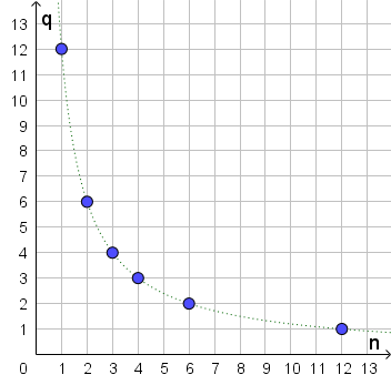 \(n\) 1 2 3 4 6 12 \(q\) 12 6 4 3 2 1 - Como as grandezas q e n são inversamente proporcionais, então \(n \times q = 12\), donde \(q = \frac{{12}}{n}\).