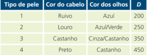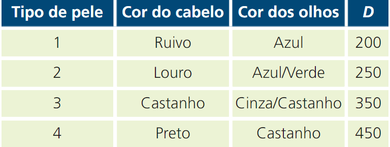 Na tabela, apresentam-se, para cada um dos principais tipos de pele da população europeia, algumas das características físicas que lhe estão associadas e o valor da constante D.