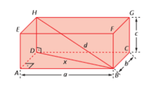 \[\begin{array}{*{20}{l}}d& = &{\sqrt {{{\overline {BD} }^2} + {{\overline {DH} }^2}} }\\{}& = &{\sqrt {{x^2} + {c^2}} }\\{}& = &{\sqrt {{{\left( {\sqrt {{a^2} + {b^2}} } \right)}^2} + {c^2}} }\\{}& = &{\sqrt {{a^2} + {b^2} + {c^2}} }\end{array}\]