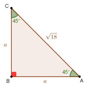 \[\begin{array}{*{20}{l}}{{a^2} + {a^2} = {{\left( {\sqrt {18} } \right)}^2}}& \Leftrightarrow &{2{a^2} = 18}\\{}& \Leftrightarrow &{{a^2} = 9}\\{}& \Leftrightarrow &{a = 3}\end{array}\]