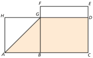 Portanto, o comprimento da diagonal do quadrado [ABGH] é \(\overline {AG} = 6\sqrt 2 \approx 8,5\) u.c. - \[{A_{\left[ {ACDG} \right]}} = \frac{{\overline {AC} + \overline {DG} }}{2} \times \overline {BG} = \frac{{14 + 8}}{2} \times 6 = 11 \times 6 = 66\]