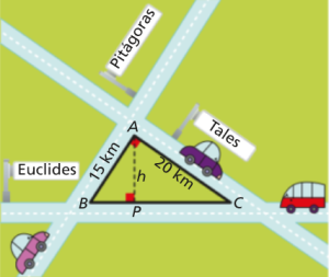 O Sr. Rocha está a passar pela estrada Tales no sentido indicado na figura. O seu destino é chegar a B. Como ia distraído, passou pelo cruzamento com a estrada Pitágoras, que é perpendicular à estrada Tales. Já havia percorrido 15 km quando percebeu o seu erro.