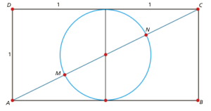 “Dois quadrados, unidos por um dos seus lados, formam o retângulo [ABCD], com os lados que medem, respetivamente, 1 e 2 unidades de medida. A diagonal [AC] interseta o lado comum aos dois quadrados. Centrada nesse ponto de interseção, desenha-se uma circunferência de diâmetro 1, que interseta [AC} nos pontos M e N.