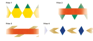 Usando blocos, o Joel construiu os seguintes frisos e representou-os no caderno.