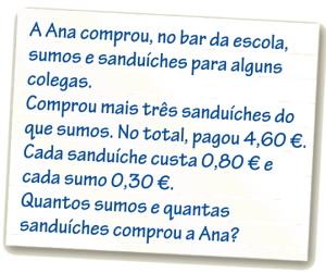 - Como a Ana “comprou mais três sanduíches do que sumos”, identifica-se que, da 1.ª equação do sistema, x traduz o número de sanduíches e y traduz o número de sumos que ela comprou.