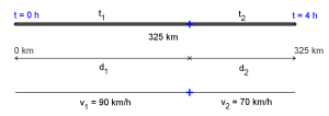 \[\begin{array}{*{20}{l}}{90 \times {t_1} + 70 \times \left( {4 – {t_1}} \right) = 325}& \Leftrightarrow &{20 \times {t_1} = 325 – 280}\\{}& \Leftrightarrow &{20 \times {t_1} = 45}\\{}& \Leftrightarrow &{{t_1} = 2,25}\end{array}\]