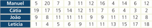 Não é possível distinguir os alunos apenas pela mediana das suas classificações, pois é igual em todos: \(\tilde x = 11\).Manuel 3 4 5 6 7 11 12 12 14 16 20 Cátia 2 3 4 6 7 11 12 14 15 17 19 João 8 8 9 9 9 11 11 11 11 11 12 Letícia 1 4 5 6 9 11 11 13 15 17 18 - A amplitude das suas classificações são as seguintes: