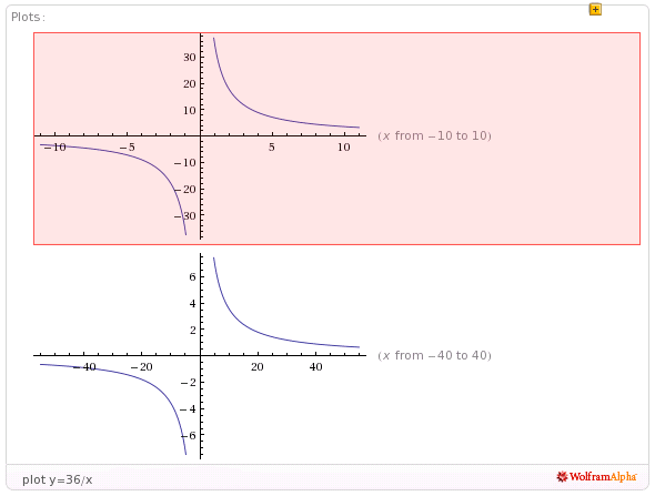 Apresenta-se, seguidamente, a hipérbole definida por $y=\frac{36}{x}$, para todo o valor de $x\ne 0$: