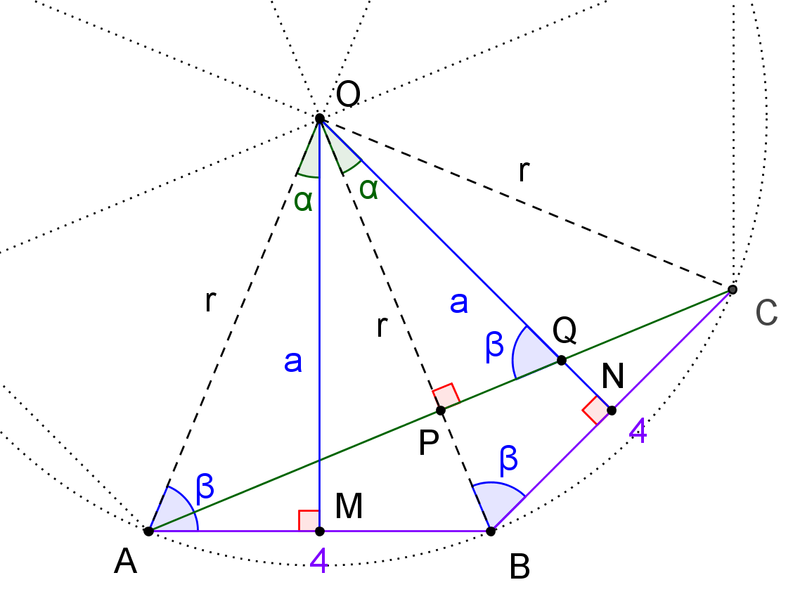 Neste momento é conveniente reparar que os triângulos [OPQ] e [CPB] são congruentes (ALA), pois, como vimos imediatamente acima, \(\overline {OP} = \overline {PC} = \frac{{\overline {AC} }}{2} = \frac{{\sqrt 2 }}{2} \times r\), pelo que será \(\overline {OQ} = \overline {BC} = 4\).