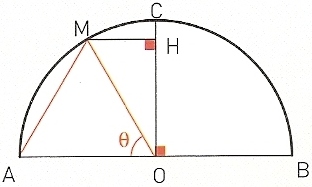 - Estude a função $g$ definida em $\left[ {0,\frac{\pi }{2}} \right]$ por $g(\theta ) = 2\operatorname{sen} \frac{\theta }{2} – \cos \theta $ e deduza a existência de um ponto M tal que $\overline {AM} = \overline {MH} $.